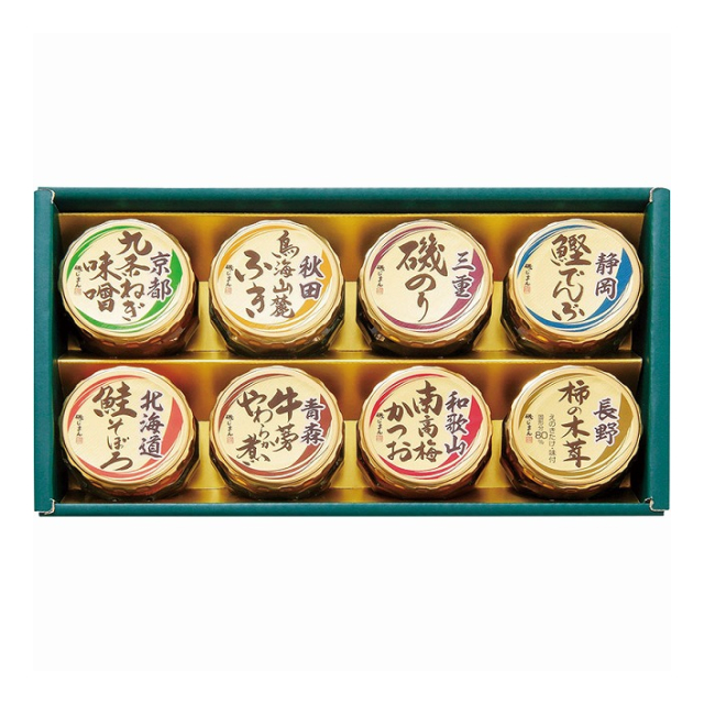 | 京都九条ねぎ味噌90g・秋田鳥海山麓ふき45g・三重磯のり90g・静岡鰹でんぶ45g・北海道鮭そぼろ40g・牛蒡やわらか煮55g・和歌山南高梅かつお90g・長野柿の木茸85g×各1 |