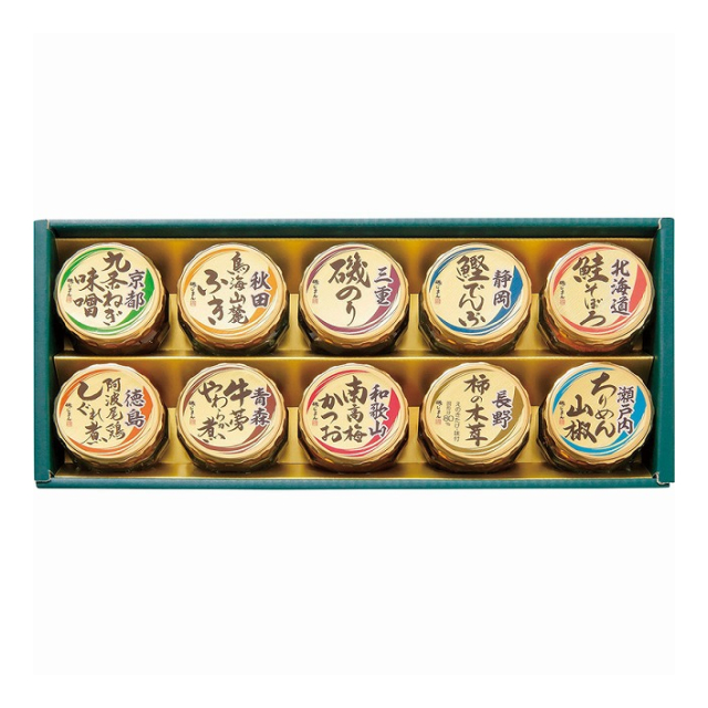 | 京都九条ねぎ味噌90g・秋田鳥海山麓ふき45g・三重磯のり90g・静岡鰹でんぶ45g・北海道鮭そぼろ40g・徳島阿波尾鶏しぐれ煮55g・青森牛蒡やわらか煮55g・和歌山南高梅かつお90g・長野柿の木茸85g・瀬戸内ちりめん山椒40g×各1 |