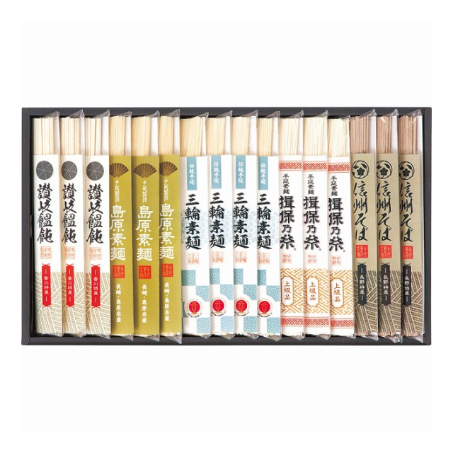| 三輪素麺50g×4、揖保乃糸・島原素麺・信州そば・讃岐うどん各50g×各3 |