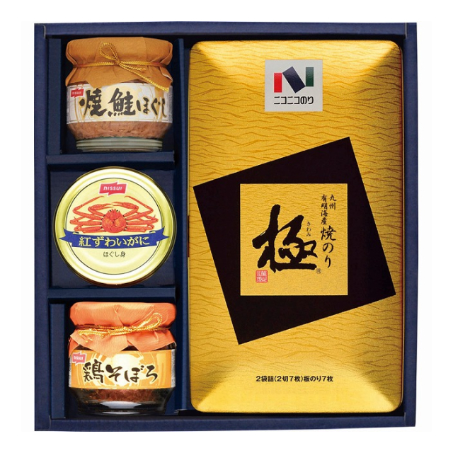 | 焼のり2切7枚2袋詰・紅ずわいがにほぐし身55g・焼鮭ほぐし50g・鶏そぼろ50g×各1 |