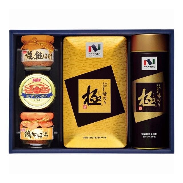 | 焼のり2切7枚2袋詰・味のり8切5枚10袋詰・紅ずわいがにほぐし身55g・焼鮭ほぐし50g・鶏そぼろ50g×各1 |