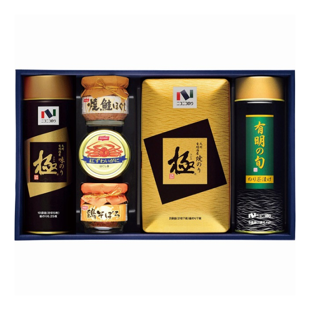 | 焼のり2切7枚2袋詰・味のり8切5枚10袋詰・紅ずわいがにほぐし身55g・焼鮭ほぐし50g・鶏そぼろ50g・のり茶漬け8袋×各1 |