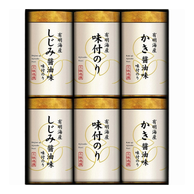 | 味付のり かき醤油味(8切16枚)・味付のりしじみ醤油味(8切16枚)・味付のり(8切16枚)×各2 |