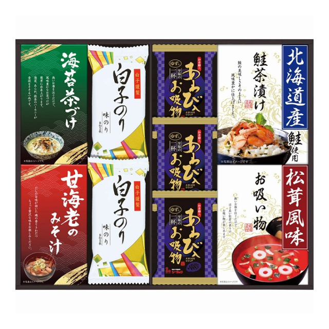 | あわび入お吸い物×3、北海道産鮭茶漬け3袋・永谷園松茸風味お吸い物4袋・甘海老みそ汁2袋・丸美屋のり茶漬け4袋×各1、白子のり(8切5枚)×2 |