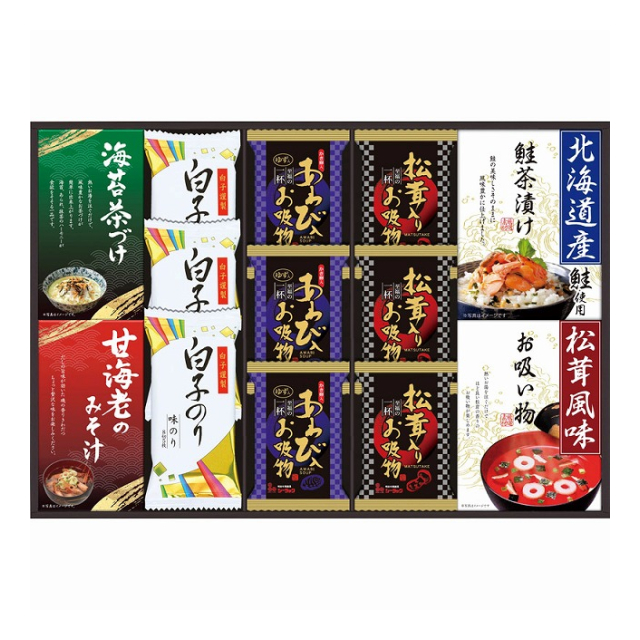 | あわび入お吸い物・松茸入りお吸い物×各3、北海道産鮭茶漬け3袋・永谷園松茸風味お吸い物4袋・甘海老みそ汁2袋・丸美屋のり茶漬け4袋×各1、白子のり(8切5枚)×3 |