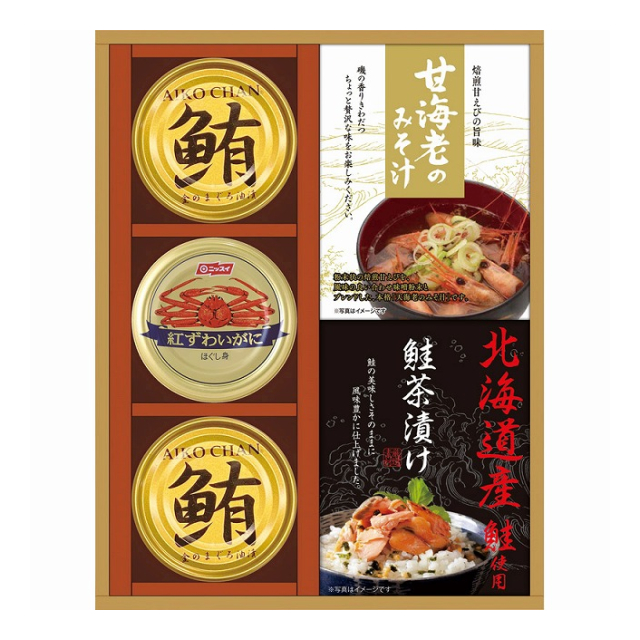 | 紅ずわいがにほぐし身55g・甘海老みそ汁3袋・北海道産鮭茶漬け3袋×各1、鮪油漬フレーク70g×2 |