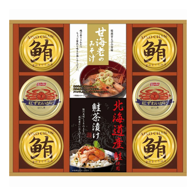 | 紅ずわいがにほぐし身55g×2、甘海老みそ汁3袋・北海道産鮭茶漬け3袋×各1、鮪油漬フレーク70g×4 |