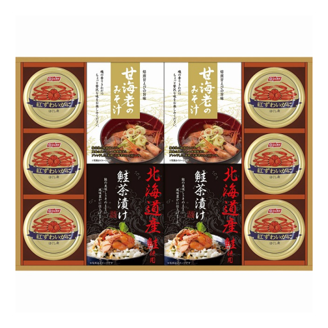 | 紅ずわいがにほぐし身55g×6、甘海老みそ汁3袋・北海道産鮭茶漬け3袋×各2 |