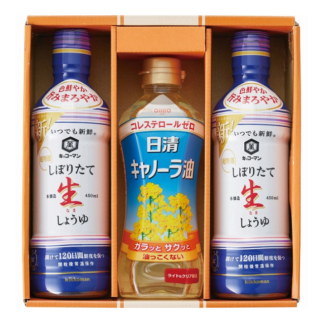 | 日清キャノーラ油350g×1、キッコーマンしぼりたて生しょうゆ450mL×2 |