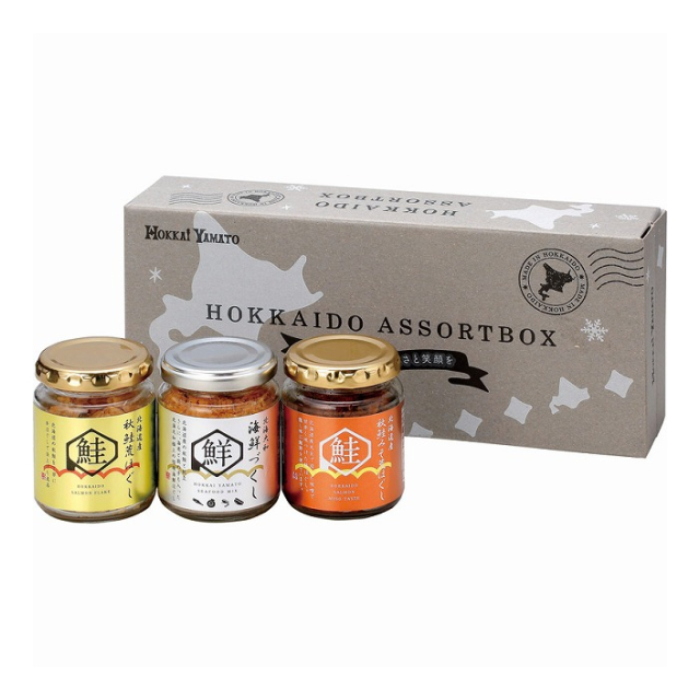 | 海鮮づくし80g・秋鮭荒ほぐし70g・秋鮭みそ荒ほぐし90g×各1 |