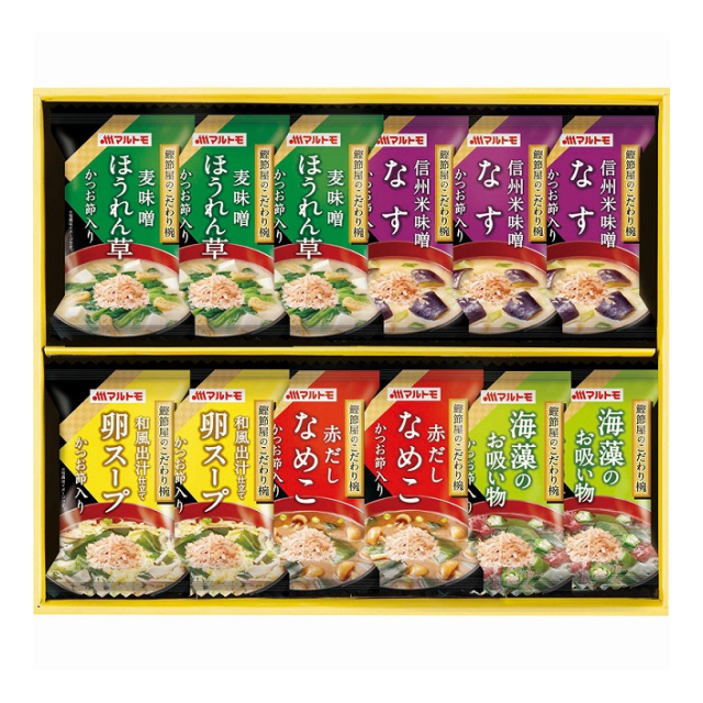 | なめこの味噌汁・卵スープ・海藻のお吸い物×各2、ほうれん草の味噌汁・なすの味噌汁×各3 [品番: MS-20F] [JAN: 4900000000000] | 1 | 2,000 円 | ログインすると表示 |