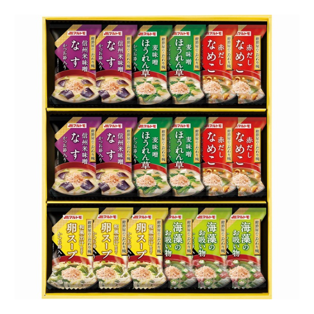 | なめこの味噌汁・ほうれん草の味噌汁・なすの味噌汁×各4、卵スープ・海藻のお吸い物×各3 [品番: MS-30F] [JAN: 4900000000000] | 1 | 3,000 円 | ログインすると表示 |