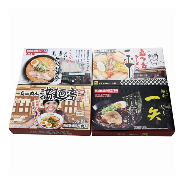 | 札幌「いちまる」味噌味・喜多方「一平」醤油味・広島「満麺亭」醤油味・博多中州「一矢」とんこつ味各2食入×各1 |