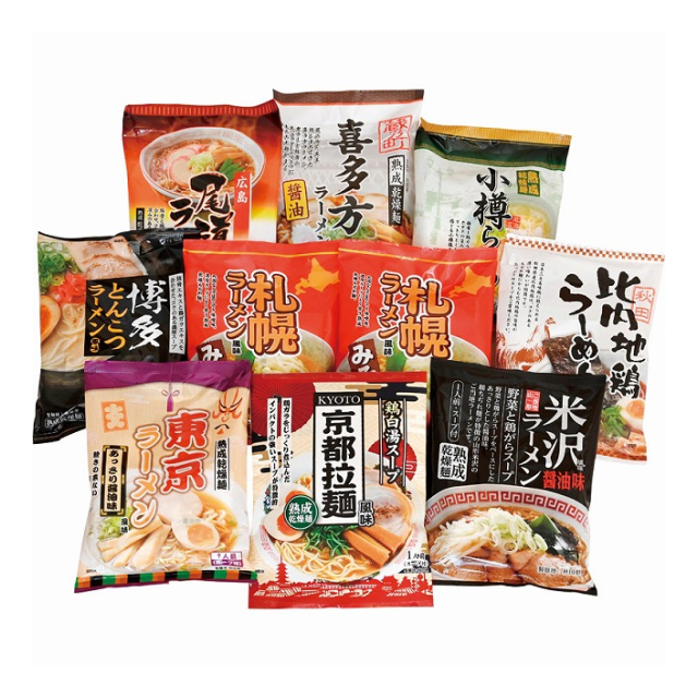 | 札幌 味噌味×2、小樽 塩味・秋田 比内地鶏醤油味・米沢 醤油味・喜多方 醤油味・東京 醤油味・京都 醤油味・尾道 醤油味・博多 とんこつ味×各1 |