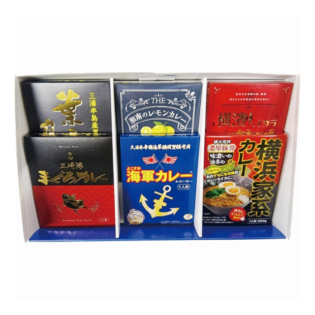 | 横浜家系カレー200g・よこすか海軍カレーネイビーブルー180g・湘南のレモンカレー200g・横濱ハイカラビーフカレー180g・三崎港まぐろカレー180g・葉山牛カレー210g×各1 |