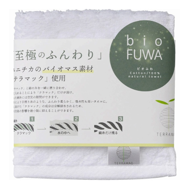 「至極のふんわり」ユニチカのバイオマス素材「テラマック」使用。テラマックと綿の糸を一緒に撚り合わせ、水に入れることによりテラマックだけが溶け、残った綿糸には空気の隙間ができます。これにより甘撚り糸のような、ふんわり柔らかく、吸水性の高いタオルに。水に溶けたテラマックの成分は分解排水されるため、河川汚染の影響を最小限に抑えることができます。