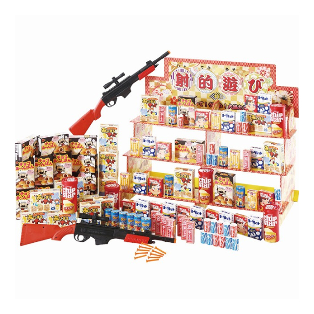 | ディスプレイ台:695×800×380mm、鉄砲×2、吸盤弾×20、お菓子アソート×100 |