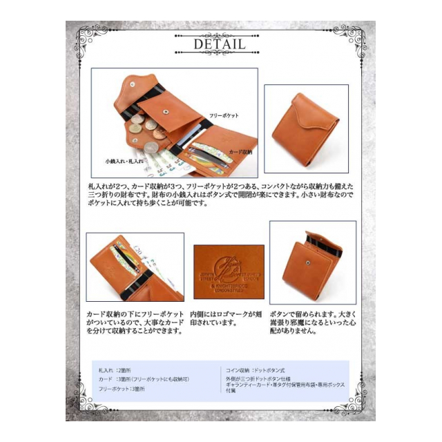| ■素材→牛革(日本製ブライドルレザー)、布、PVC ■付属品→ギャランティカード、革タグ付き保管用布袋、専用保存箱 ■規格→札入れX2、カード入れX3、ドットボタン式小銭入れX1、フリーポケットX3 ■ブランド名→HARVIE&HUDSON |