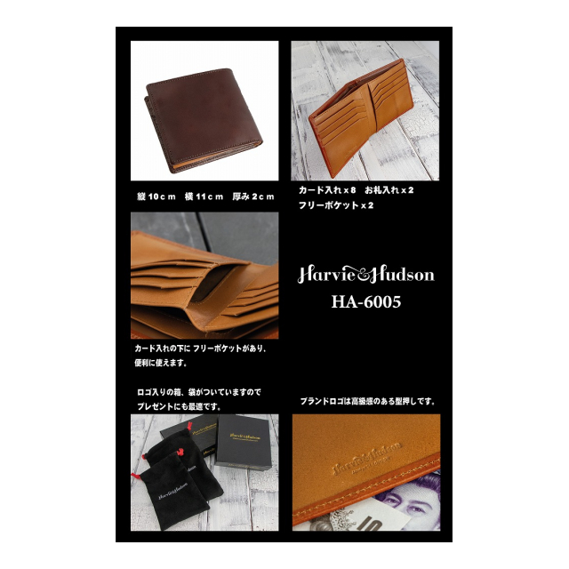 | ■素材→イタリアンレザー(キャピタル社製) ■付属品→保管用布袋、専用保存箱 ■規格→札入れX2、カード入れX8、フリーポケットX2 ■ブランド名→HARVIE&HUDSON |