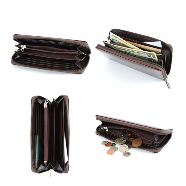 機能面もしっかり作りこまれており、そのスマートな容姿とは裏腹に札入れスペースx3・カード入れx8・フリーポケットx2 ファスナー式小銭入れx1と余裕たっぷりの収納力を誇っています。多彩な収納力による機能性、サイズ感と相まって非常に扱いやすいラウンド長財布に仕上がっております。