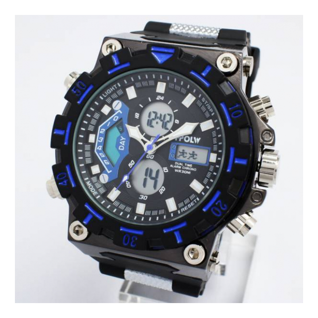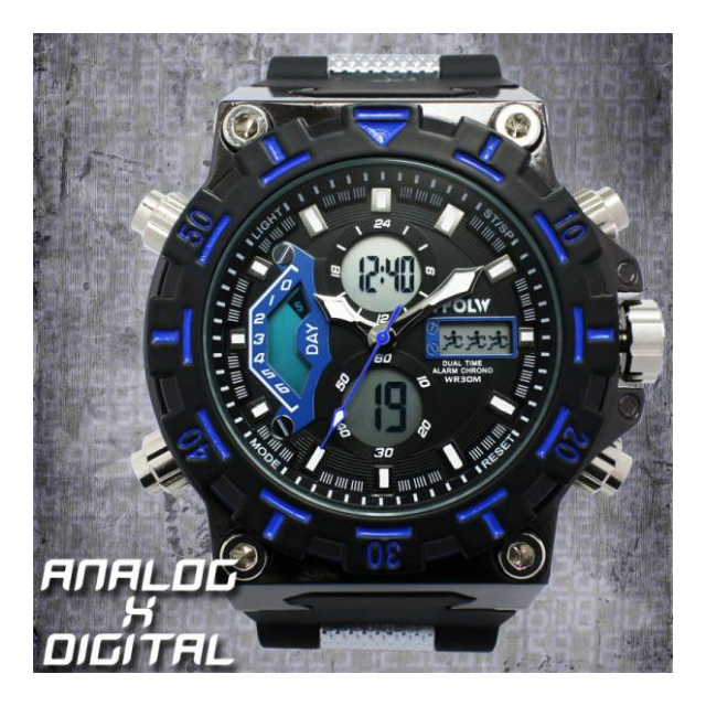 日付はもちろん、月、曜日も表示し、アラームと時報、さらにストップウォッチ機能までもが搭載されたマルチファンクションモデル(多機能モデル)で、アナログ表示とデジタル表示は違う時間を表示できることが可能なので、デュアルタイム表示も可能です。