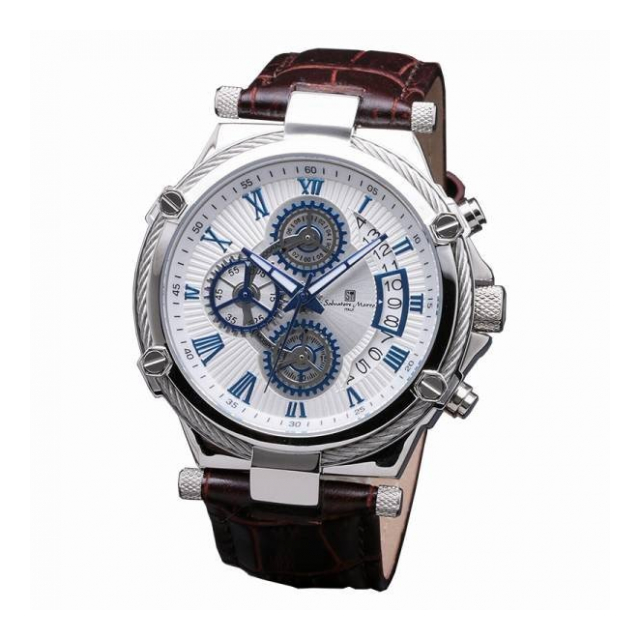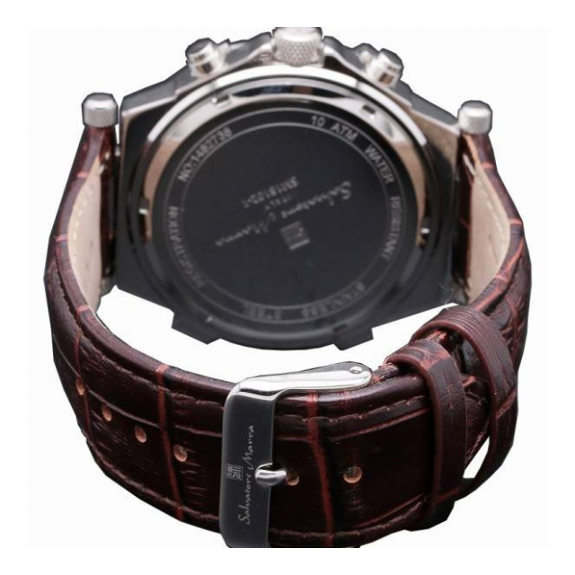 | ■素材→レザー、ステンレススチール、ミネラルクリスタルガラス ■付属品→純正保存箱、保証書(ご購入日より1年間)、取扱説明書 ■規格→日本製クォーツ(電池式)、クロノグラフ(1/1秒計、1/10秒計、60分積算計)、日付表示、10気圧防水 ■ブランド名→Salvatore Marra |