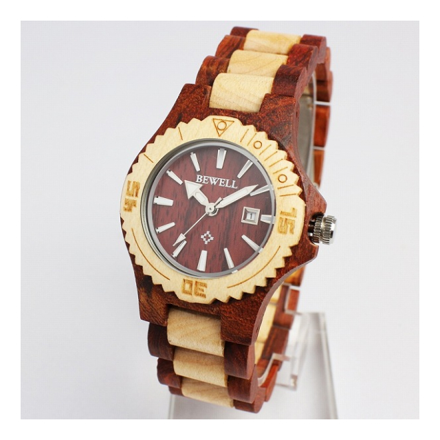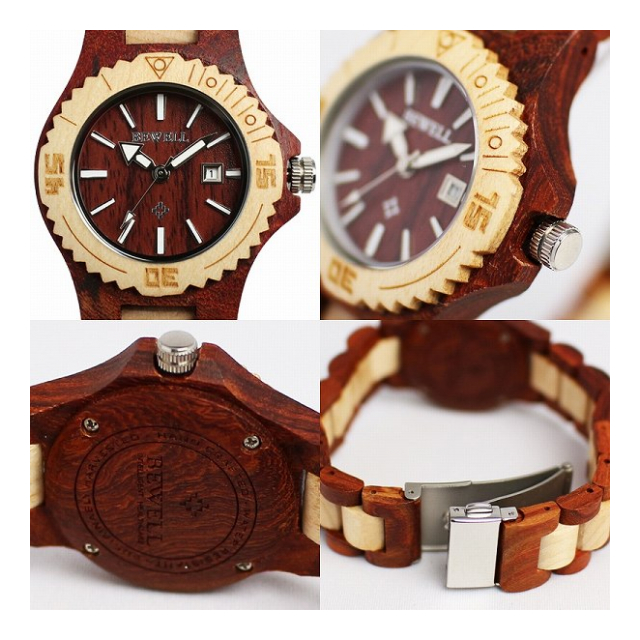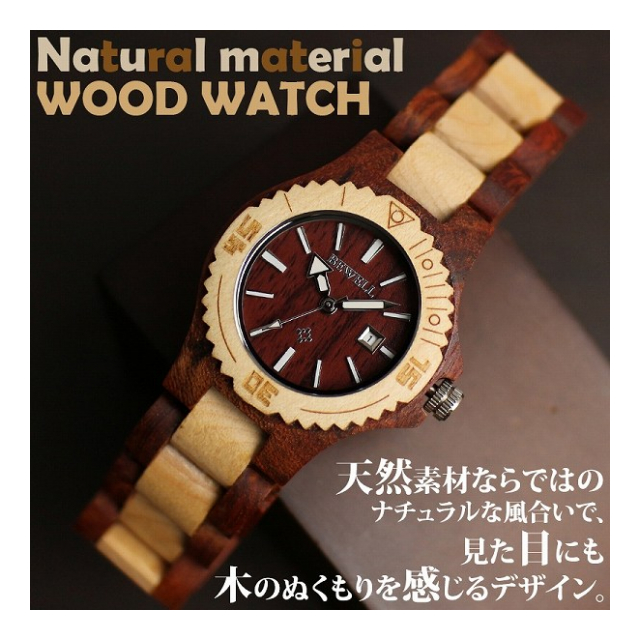 | ■素材→天然木(紅檀、楓木)、ミネラルガラス、ステンレススティール、日本製シチズンMIYOTAムーブメント(2015) ■付属品→保証書(ご購入日より6ヶ月) ■規格→クォーツ(電池式)※日本製ムーブメント、日付カレンダー |