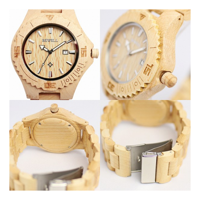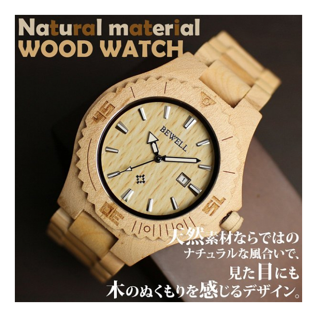 | ■素材→天然木(楓木)、ミネラルガラス、ステンレススティール、日本製シチズンMIYOTAムーブメント(2115) ■付属品→保証書(ご購入日より6ヶ月) ■規格→クォーツ(電池式)※日本製ムーブメント、日付カレンダー |