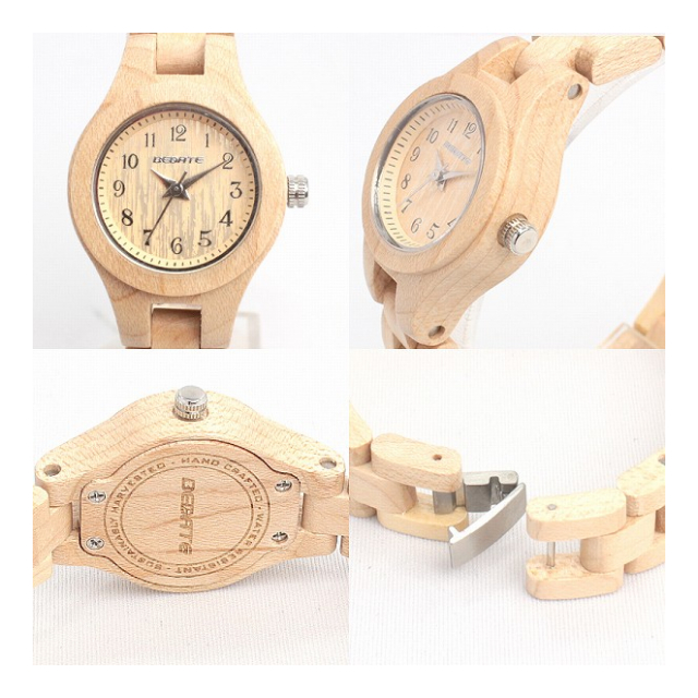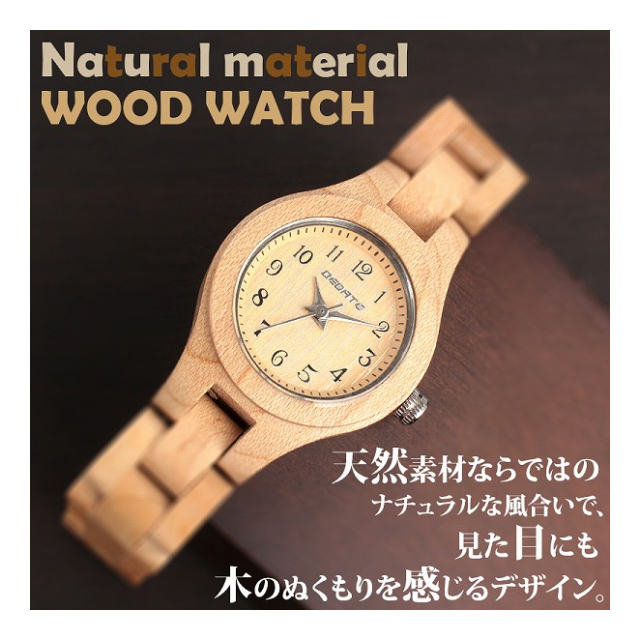 | ■素材→天然木(楓木)、ミネラルガラス、ステンレススティール、日本製シチズンMIYOTAムーブメント(2035) ■付属品→保証書(ご購入日より6ヶ月) ■規格→クォーツ(電池式)※日本製ムーブメント |