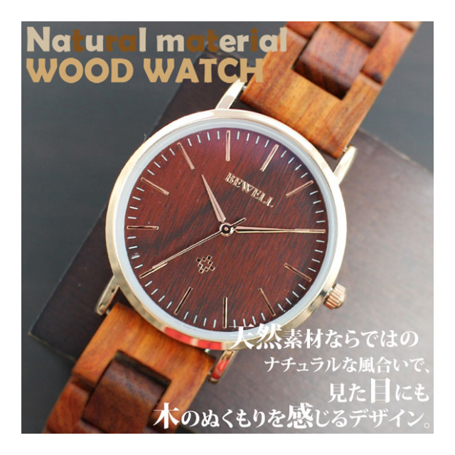 | ■素材→天然木(赤檀)、ミネラルガラス、ステンレススティール、合金 ■付属品→保証書(ご購入日より1年間) ■規格→クォーツ(電池式) |