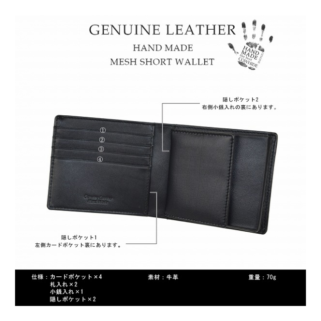 | ■素材→牛革 ■付属品→- ■規格→札入れ×2、カードポケット×4、小銭入れ×1、隠しポケット×2 ■ブランド名→HANDMADE |
