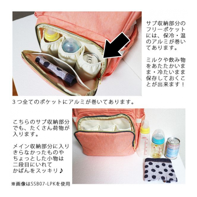 保冷・保温効果のあるアルミシートを巻いているポケットが付いているので、ミルクなど飲み物などを入れておくのに便利です♪