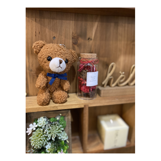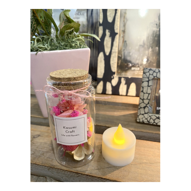 プリザーブドのかすみそうやいろんなドライの花材をつめたコルクミニボトルです。