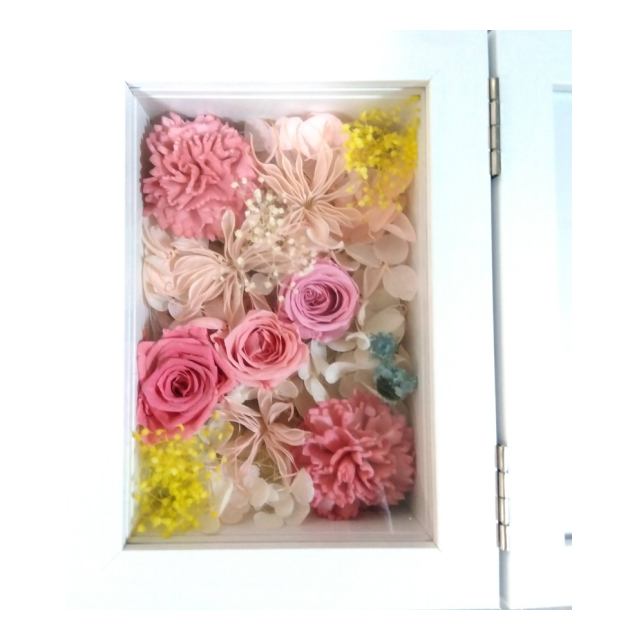 | プリザーブドフラワーバラ×3、ソーラーカーネーション×2、ドライフラワー、リボン、木製フォトボックス |