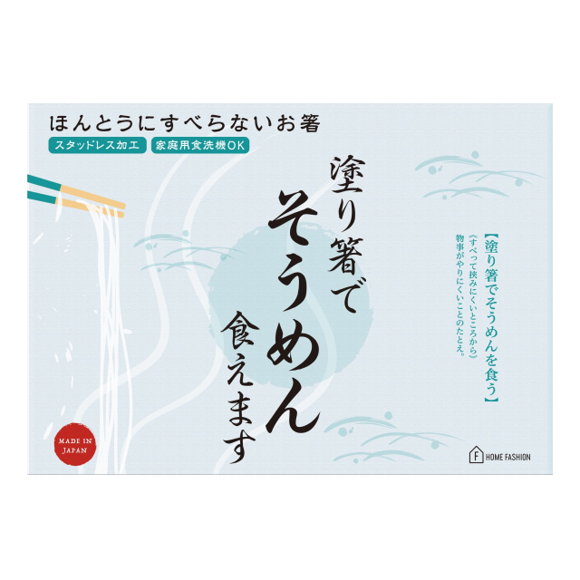 スタッドレス加工によって、ツルっとした麺類やこんにゃくも簡単につかめる「ほんとうにすべらないお箸」