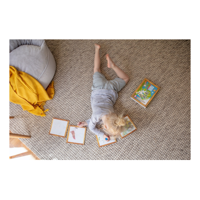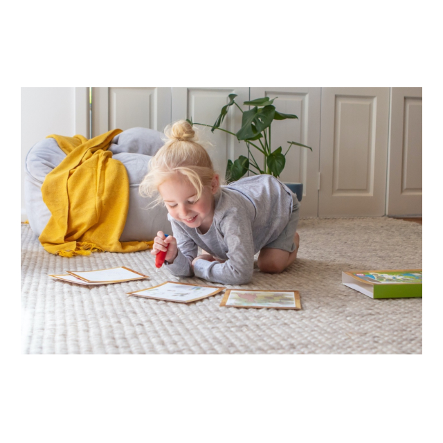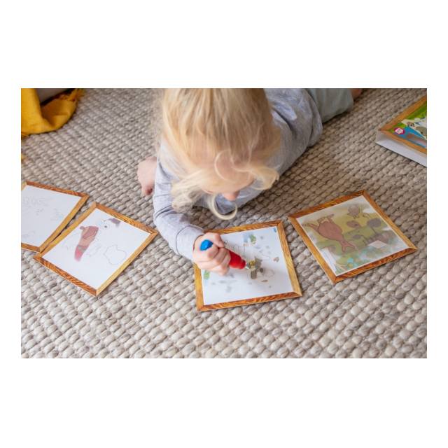 水で濡らすと絵が浮き出てくる不思議なぬりえです。付属のブラシのボトルに水を入れてお絵かきすると、イラストが浮かび上がってきます。乾けばまた白く戻るので何度でも遊べます。ペイントカードの裏には「見つけてみよう」と、いくつかのアイテムのお題が描かれています。