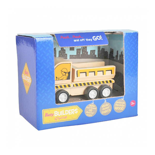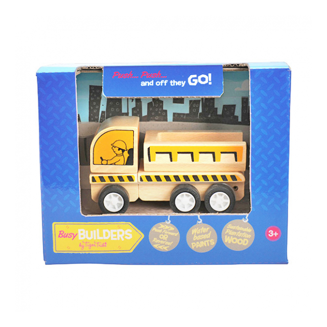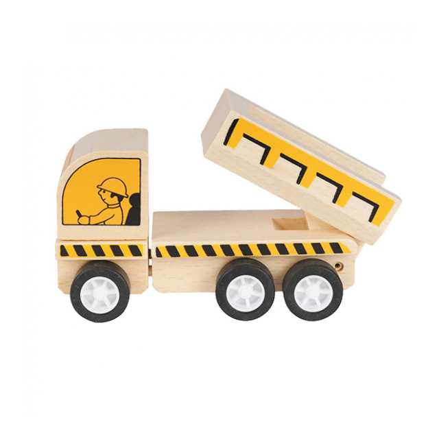 はたらくくるま工事現場シリーズのダンプカーの木製玩具です。EN71規格で、環境に優しいバーチ合板と非毒性塗料を使用しているので、お子様にも安心して遊んでいただけます。また、手で前に押すように走らせ、手を離すとしばらく走り続けます。