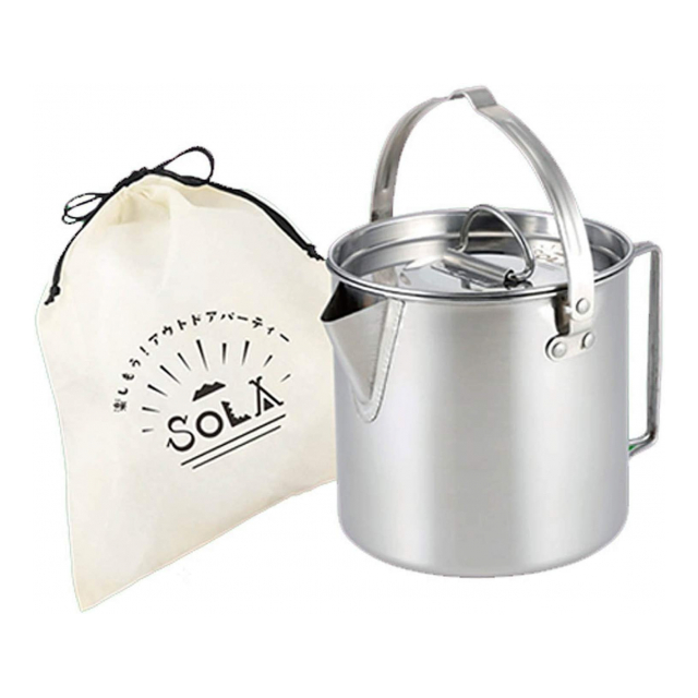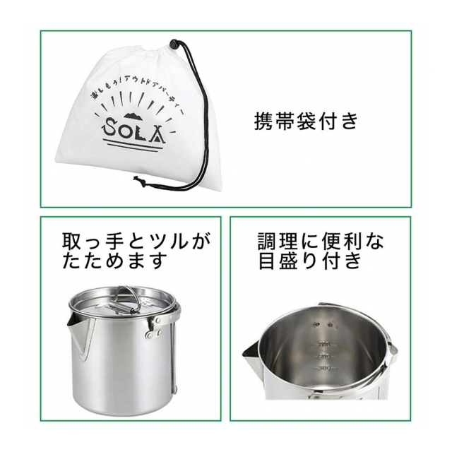 | ■商品サイズ:140×152×118mm(満水容量:1.2L、適正容量:0.7L) ■商品重量:本体/358g、収納袋/26g ■材質:ケトル/18-0ステンレス(底の厚さ:0.5mm)、携帯袋/不織布(PP) |