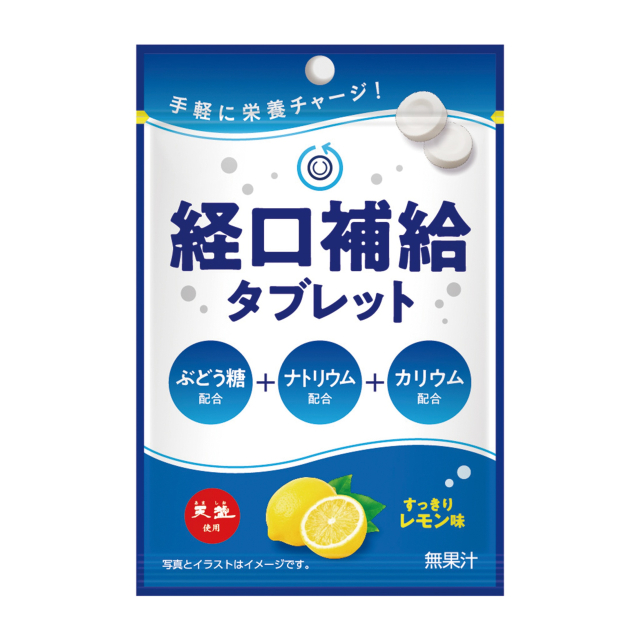 エネルギー源となるぶどう糖、暑熱環境で失われやすいミネラル(ナトリウム・カリウム)、元気を後押しするクエン酸を配合したタブレットです。暑い季節でも食べやすいすっきりレモン味。