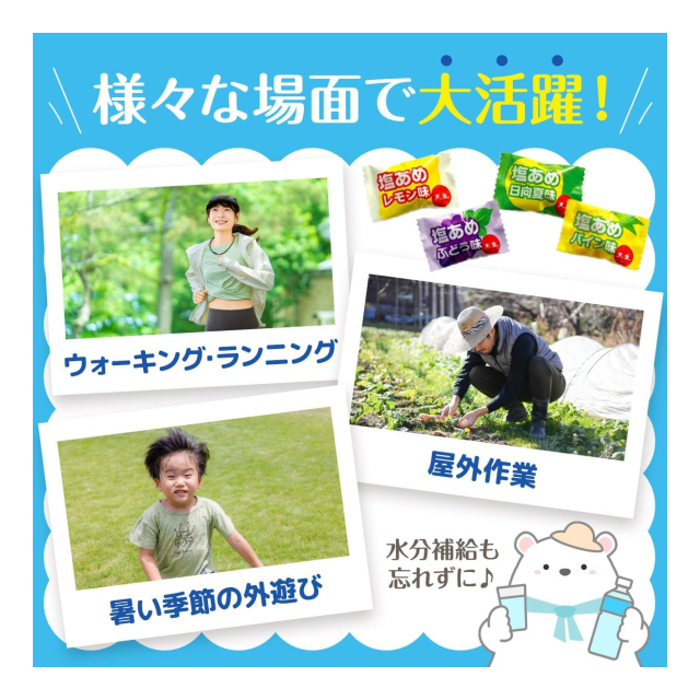 4種類の味(ぶどう・日向夏・パイン・レモン)のアソートタイプで、美味しく飽きずに暑さ対策ができる塩あめです。