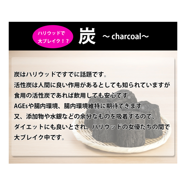 体内に取り入れる炭の吸着力により、有害物質や毒素の吸着・排出効果や抗糖化が期待される手軽なデトックス法として人気の商品です。