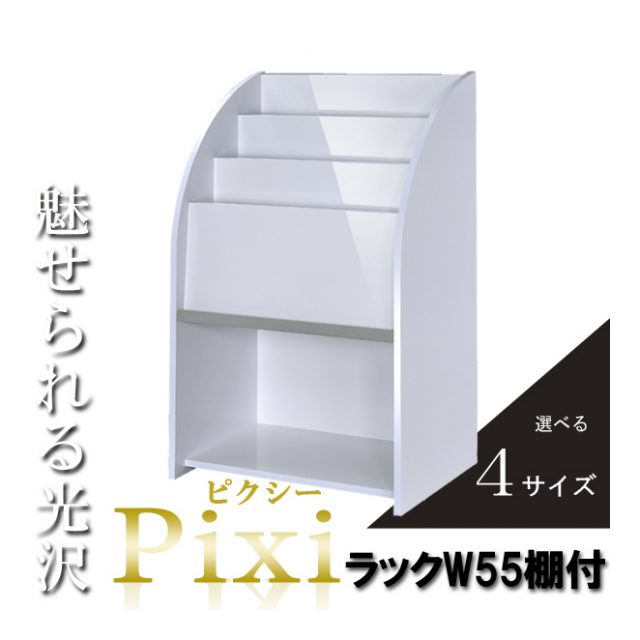 選べるサイズ×カラー!鏡面仕上げの雑誌ラック【Pixi】 ピクシー 棚付き 幅55cm 奥行35cm ホワイト