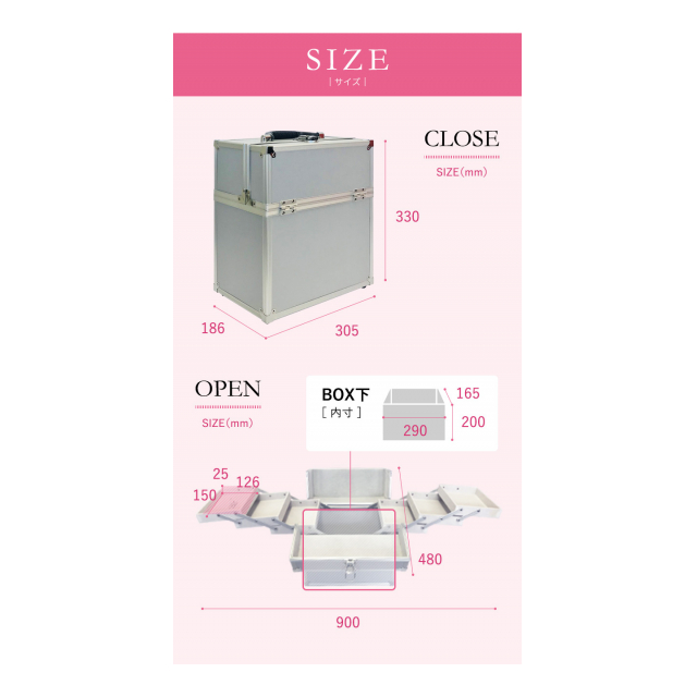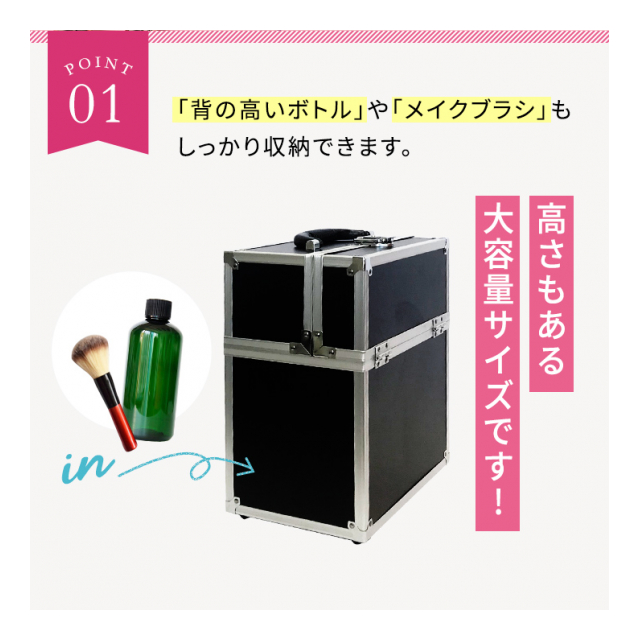 内部には左右に広がる6枚のトレイがついておりかさばる化粧道具をばっちり収納。