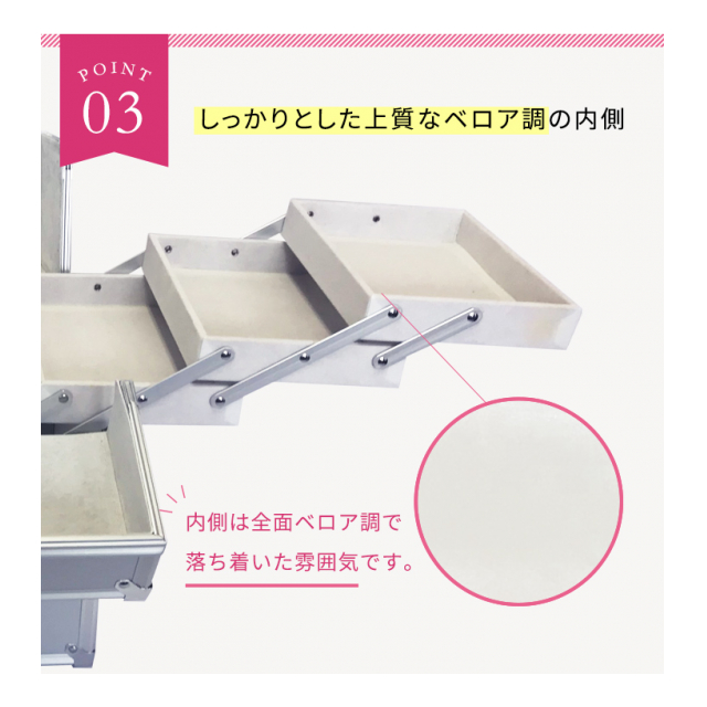 トレイはベルベット調となっており内部からのおしゃれにもこだわる大人の女性の期待にも応える仕様となっております。