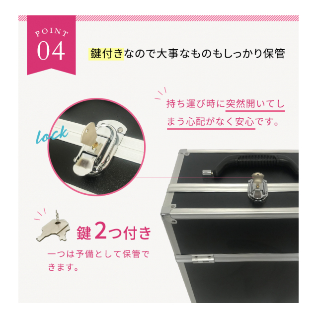コスメBOX本体と本体とは別に鍵がついており、盗難防止・持ち運び中突然開いてしまうトラブルを防止します。