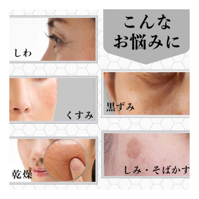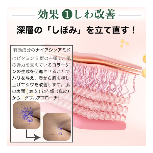 ●シワ改善の秘密:コラーゲン減少を改善し抗シワ光老化作用、肌荒れを防ぎ、血行を促進、バリア機能をサポートし、美しい肌へ。ナイアシンアミド+グリチルリチン酸ジカリウムにナス果実エキス配合:若々しく、健常なお肌へと導く。