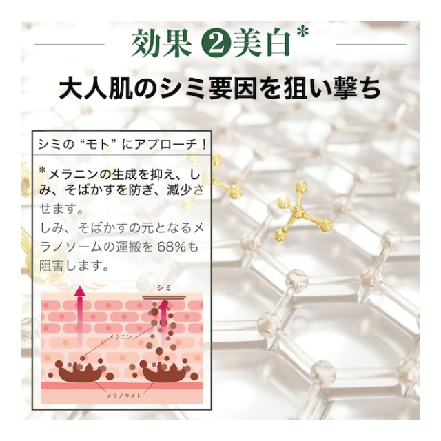 ●美白効果:美白効果で白く輝くお肌に。ナイアシンアミドはお肌表面の色素沈着の発生を防ぎ、減少させます。