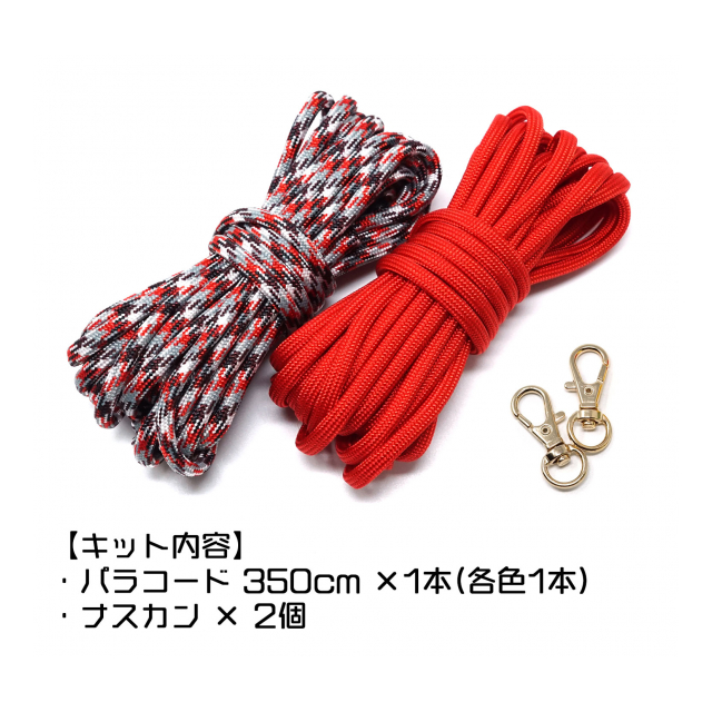 | ●キット内容:パラコード350cm×2本(各色1本)、ナスカン×2個●パラコード材質:ナイロン100%●パラコード太さ:4mm●パラコード耐荷重:250kg●原産国:パラコード:アメリカ合衆国、ナスカン:日本 |
