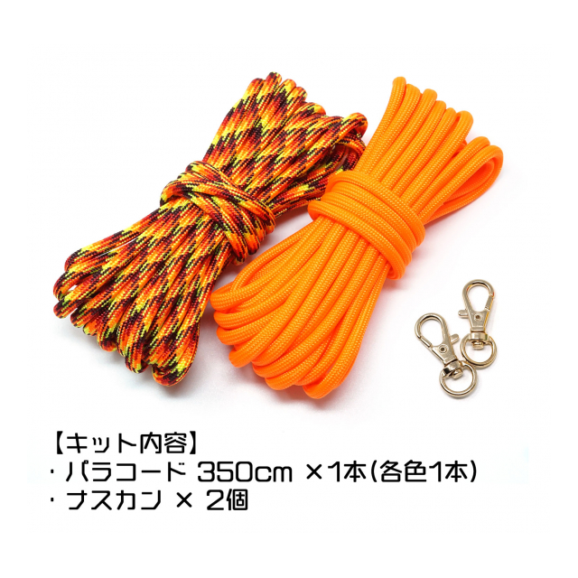 | ●キット内容:パラコード350cm×2本(各色1本)、ナスカン×2個●パラコード材質:ナイロン100%●パラコード太さ:4mm●パラコード耐荷重:250kg●原産国:パラコード:アメリカ合衆国、ナスカン:日本 |