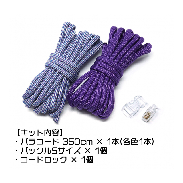 | ●キット内容:パラコード350cm×2本(各色1本)、バックルSサイズ×1個、コードロック×1個●パラコード材質:ナイロン100%●パラコード太さ:4mm●パラコード耐荷重:250kg●原産国:パラコード:アメリカ合衆国、バックルSサイズ、コードロック:日本 |